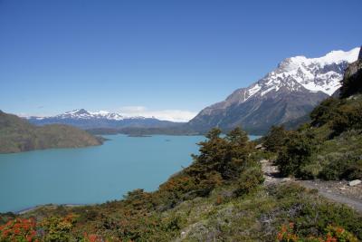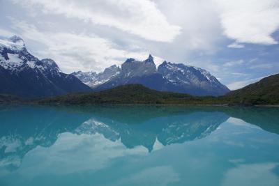 Unsere Trekkingtour im Nationalpark begann mit einer tollen Catamaranfahrt ueber einen Gletschersee, Lago Pehoe, das gespiegelte Panorama war atemberaubend.