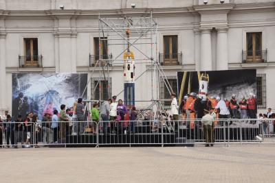 Die derzeitige Attraktion Santiagos ist die Rettungskapsel der verschuetteten Bergleute, die vor der La Moneda, dem Regierungssitz des Praesidenten, aufgebaut ist. Auch wir haben es uns nicht nehmen lassen aus der Ferne ein Auge auf sie zu werfen. In die lange Warteschlange haben wir uns nicht eingereiht